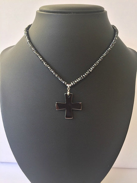 A stunning faceted hematite bead necklace with a gorgeous Cross pendant.